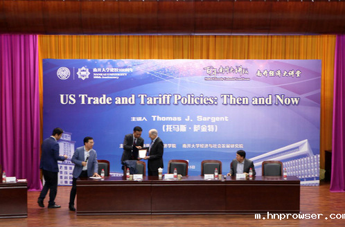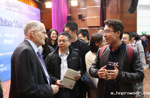在简短的致聘仪式之后,萨金特教授随即为在场的近500名师生做了一场精彩的主题演讲,作为“百年南开大讲坛”和“南开经济大讲堂”系列的校庆特别讲座,向百年南开献礼。