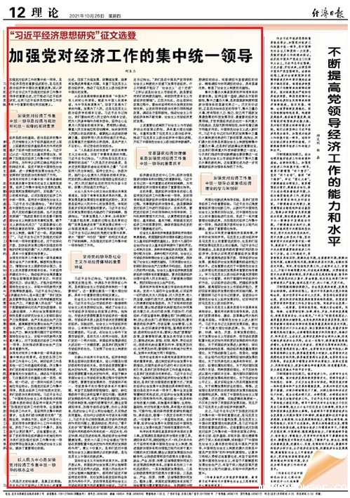 加强党对经济工作的集中统一领导,是习近平经济思想的重要组成部分,是马克思主义政治经济学中国化的重要成果。深入研究习近平总书记关于加强党对经济工作集中统一领导的重要论述,对于推动习近平经济思想研究,运用习近平经济思想指导工作实践,具有十分重要的理论和实践意义。