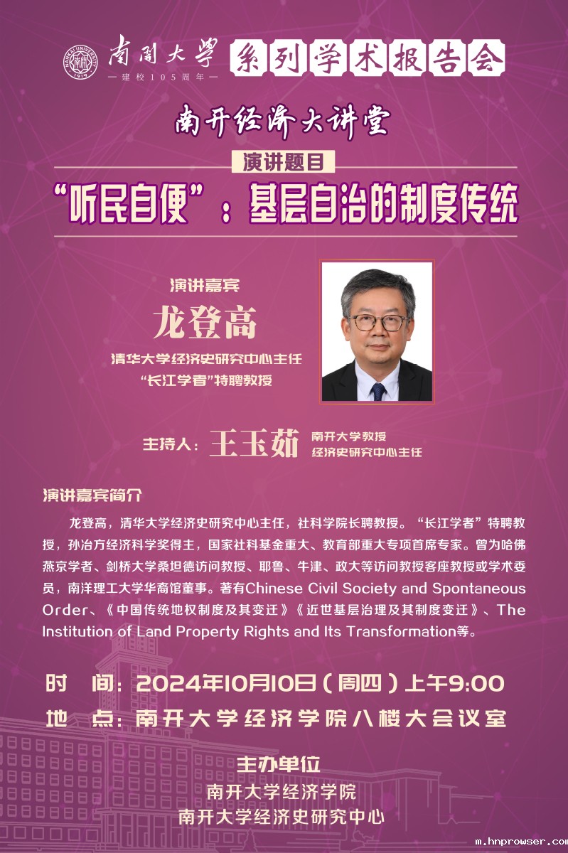 演讲嘉宾简介:龙登高,清华大学经济史研究中心主任,社科学院长聘教授。“长江学者”特聘教授,孙冶方经济科学奖得主,国家社科基金重大、教育部重大专项首席专家。曾为哈佛燕京学者、剑桥大学桑坦德访问教授、耶鲁、牛津、政大等访问教授客座教授或学术委员,南洋理工大学华裔馆董事。著有Chinese Civil Society and Spontaneous Order、《中国传统地权制度及其变迁》《近世基层治理及其制度变迁》、The Institution of Land Property Rights and Its Transformation等。