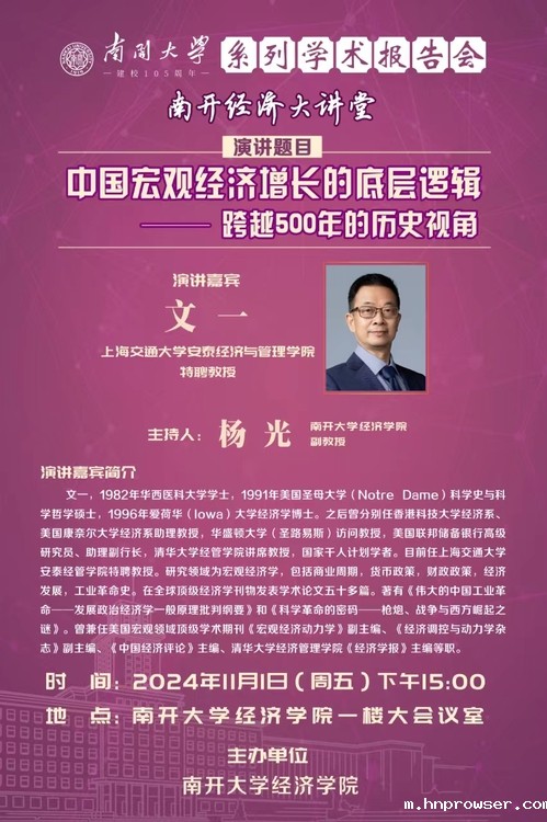 演讲嘉宾简介:文一,1982年华西医科大学学士,1991年美国圣母大学(Notre Dame)科学史与科学哲学硕士,1996年爱荷华(Iowa)大学经济学博士。之后曾分别任香港科技大学经济系、美国康奈尔大学经济系助理教授,华盛顿大学(圣路易斯)访问教授,美国联邦储备银行高级研究员、助理副行长,清华大学经管学院讲席教授,国家千人计划学者。目前任上海交通大学安泰经管学院特聘教授。研究领域为宏观经济学,包括商业周期,货币政策,财政政策,经济发展,工业革命史。在全球顶级经济学刊物发表学术论文五十多篇。著有《伟大的中国工业革命──发展政治经济学一般原理批判纲要》和《科学革命的密码──枪炮、战争与西方崛起之谜》。曾兼任美国宏观领域顶级学术期刊《宏观经济动力学》副主编、《经济调控与动力学杂志》副主编、《中国经济评论》主编、清华大学经济管理学院《经济学报》主编等职。。