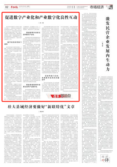 数字经济包括数字产业化和产业数字化两部门,二者的良性互动是数字经济发展的核心驱动力。党的二十届三中全会《决定》从“健全促进实体经济和数字经济深度融合制度”视角,提出了发展数字经济的重点领域、战略举措和政策取向,强调“加快构建促进数字经济发展体制机制,完善促进数字产业化和产业数字化政策体系”,为数字经济发展指明了方向。