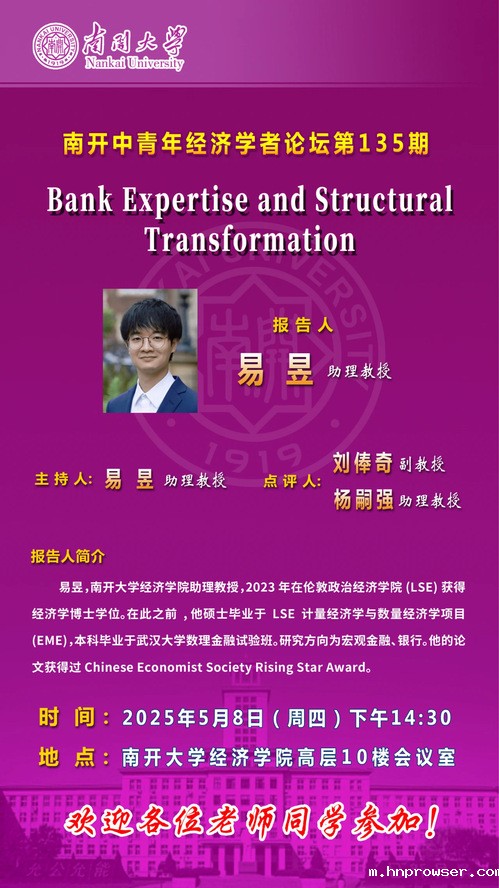 报告人简介:易昱,伟德软件助理教授,2023年在伦敦政治伟德app官网登录(LSE)获得经济学博士学位。在此之前, 他硕士毕业于LSE计量经济学与数量经济学项目(EME),本科毕业于武汉大学数理金融试验班。研究方向为宏观金融、银行。他的论文获得过Chinese Economist Society Rising Star Award。